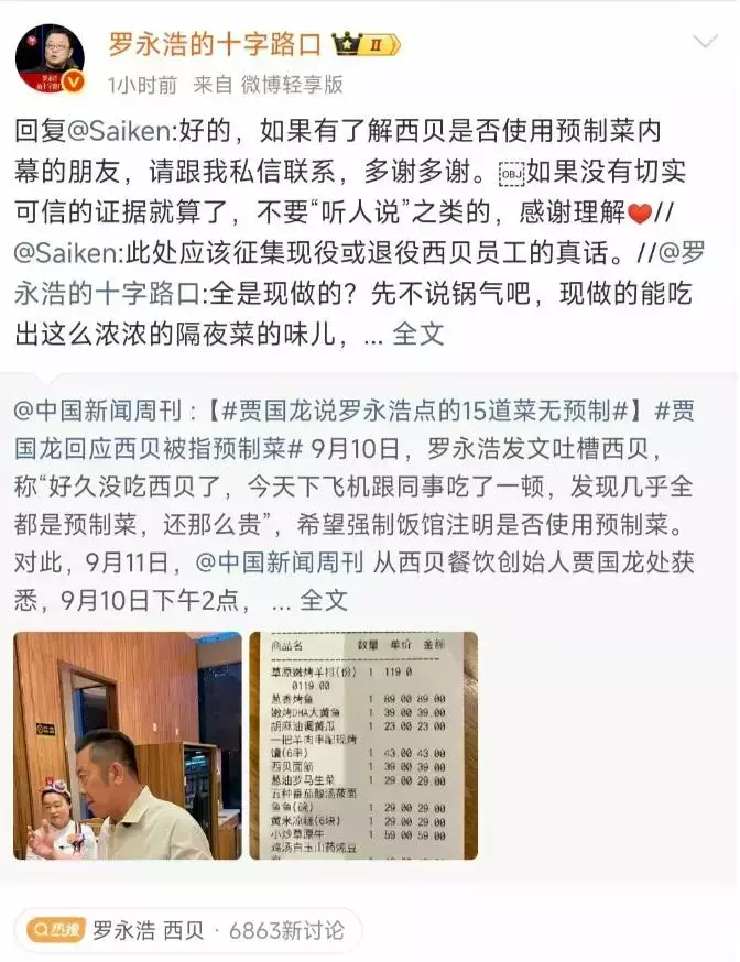? ? ? 但只要有点脑子,都能感觉到他们自己其实也挺无语的,几乎没人在讨论这个后厨在加热的算不算预制菜,实在没办法了,最后只好“顾左右而言其他”,讨论起预制菜的历史,争议甚至定价等等的一系列八卦。如果换个视角,我都差点把他们当作是“罗家人”,因为毫无疑问,只有认定完后厨的那些半成品都是预制菜了,才可能继续深究预制菜的各种标准,以及对老百姓生活的影响。不然按正常逻辑,直播过程中的主题应该是“这盆是不是预制菜?那盘肯定不是预制菜?……”,而非我看到的那一堆啰里八索。