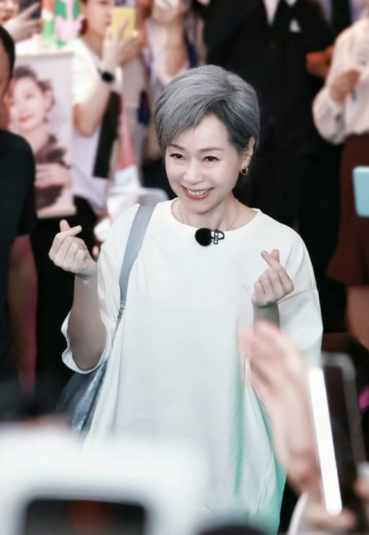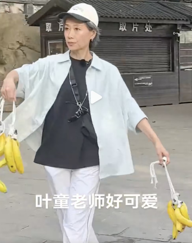 她氣場超強(qiáng),走路帶風(fēng),身邊人跟她一比都像 “小跟班”。鏡頭拉近看,她皮膚白皙,骨相優(yōu)越,越看越耐看,真是越老越精致。錄制時(shí)她還提著一串香蕉玩具搖擺舞動(dòng),看得出來心情特別好。