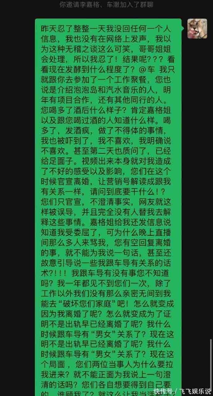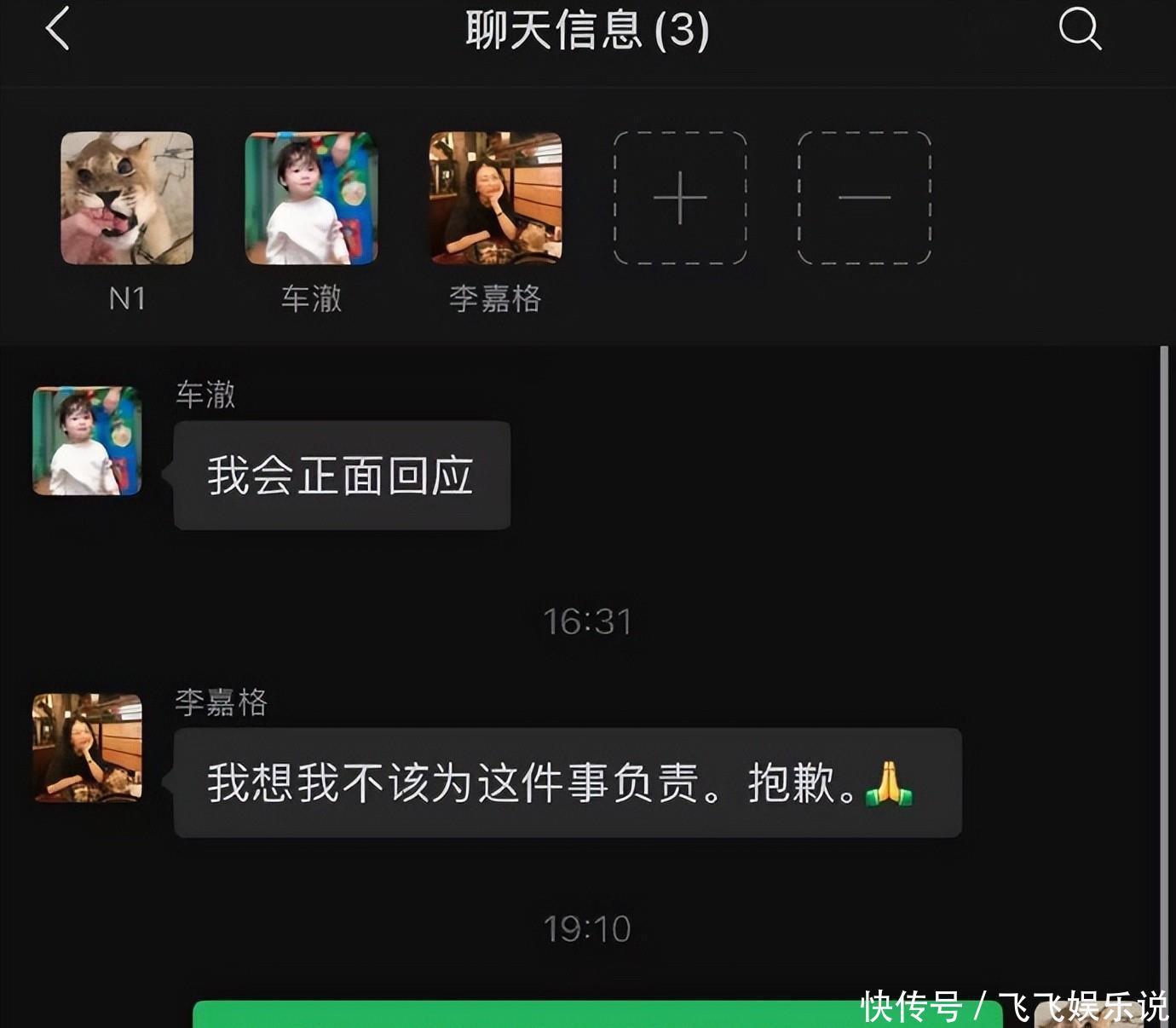 而乃萬此次的回應(yīng),最受網(wǎng)友熱議的是她拉群質(zhì)問車澈李嘉格,為何官宣離婚,導(dǎo)致她被解讀為“離婚導(dǎo)火索”而不為她澄清,不顧其名譽受損。從三人聊天記錄里看到,車澈僅回應(yīng)“會正面處理”,李嘉格稱“不該為這事負(fù)責(zé)”。而這一份聊天記錄截圖,似乎感覺三人已徹底撕破臉了。