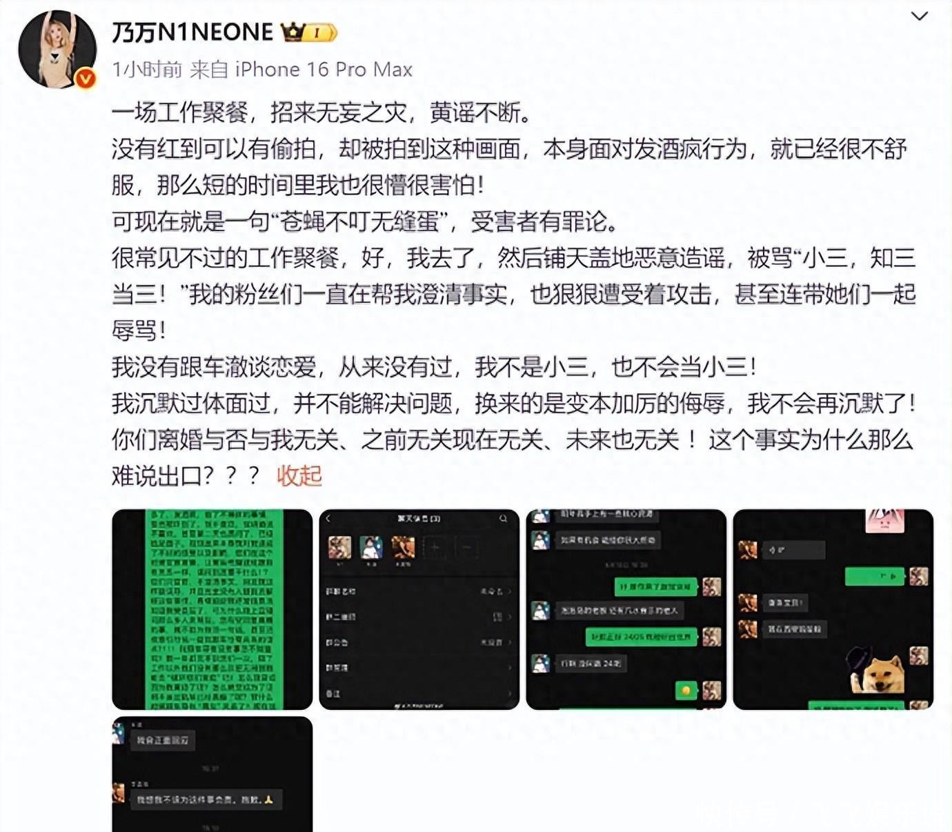 9月12日,乃萬發(fā)長文及群聊記錄強勢回應(yīng),先是否認(rèn)和車澈戀愛,再者強調(diào)當(dāng)天聚餐為工作需要。另外,乃萬還稱車澈酒后“發(fā)酒瘋”,對其做出擁抱、捏臉等令其不適的舉動,她當(dāng)場明確拒絕并次日質(zhì)問,但最終卻反遭“受害者有罪論”攻擊。