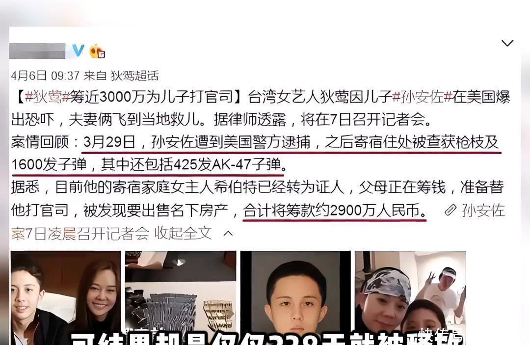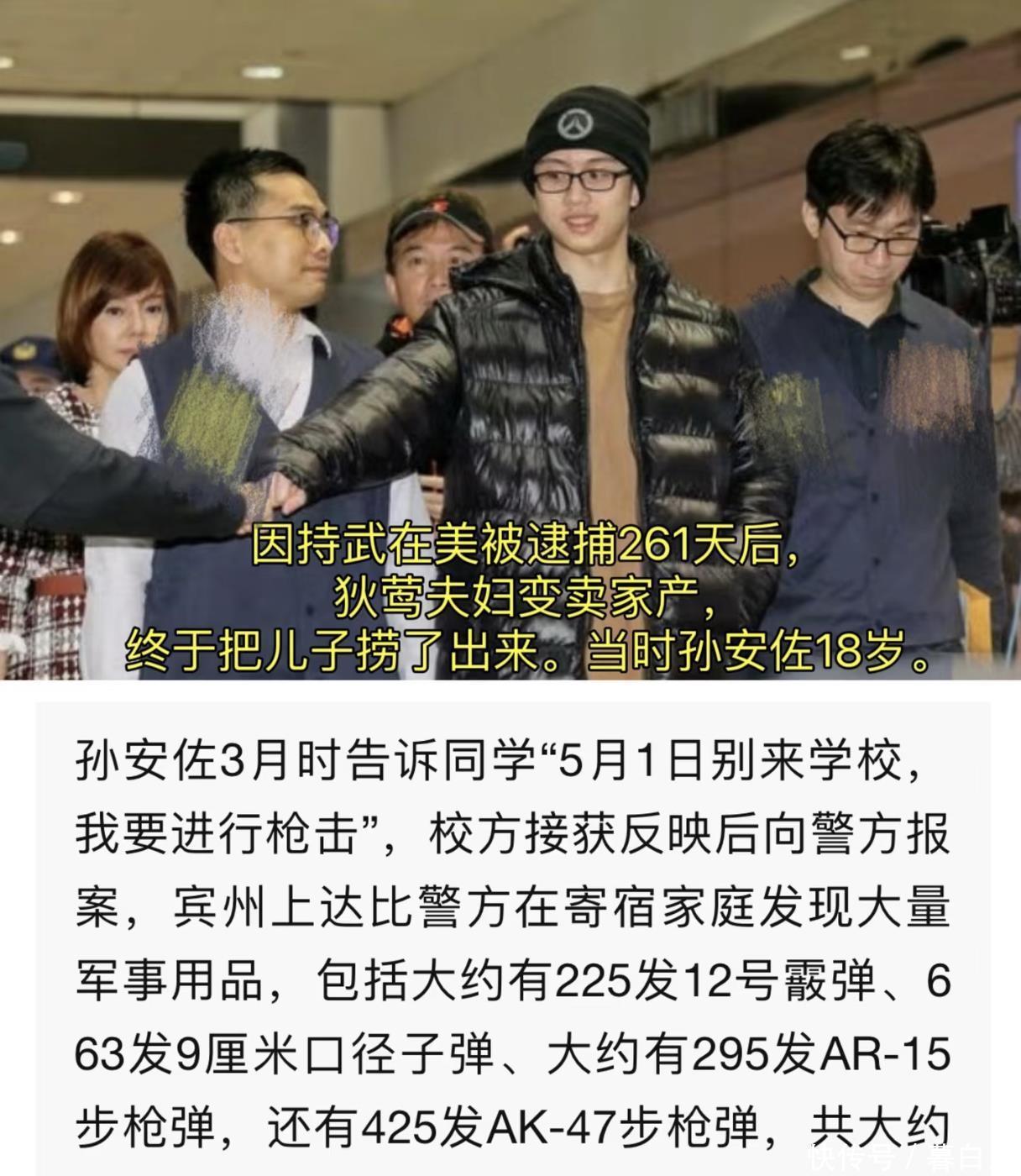 一個(gè)中國(guó)留學(xué)生,在美國(guó)非法持有槍械彈藥,還揚(yáng)言要攻擊學(xué)校?這直接撞上了美國(guó)最敏感的神經(jīng)。孫安佐立即被美國(guó)警方逮捕,可能面臨最高10年的監(jiān)禁。孫安佐出事后,狄鶯孫鵬夫婦開始各種籌錢進(jìn)行保釋,最終把豪宅賣了湊齊了保釋金。238天后孫安佐就被遣返回臺(tái)灣。