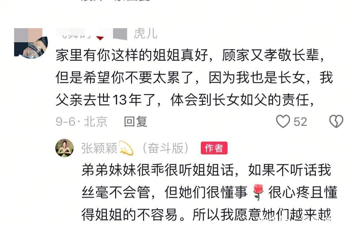 网友纷纷留言说妹妹真幸福,姐姐太好了,顾家还孝敬长辈,张颖颖说弟弟妹妹们懂事,很乖且都听姐姐的话,也体谅姐姐的辛苦与不易,她愿意弟弟妹妹们越来越好!