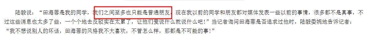 然而對于這段戀情,陸毅并不承認,他說他和田海蓉只是同學,只是普通朋友,還說田海蓉不是他喜歡的類型。