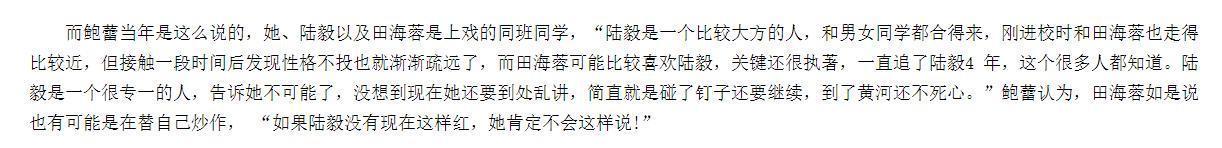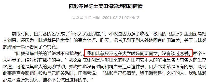隨后,陸毅的同學也是宿舍舍友的朱泳滕發(fā)聲透露,陸毅和田海蓉的確在大一好過一年,大二就分手了。