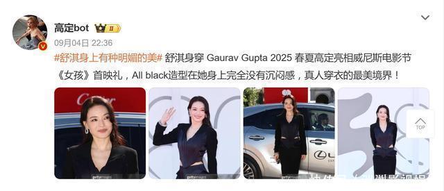 ?????? 舒淇身著一襲GauravGupta2025春夏全黑高定禮服亮相威尼斯電影節(jié)《女孩》首映禮,瞬間成為全場焦點。在直播鏡頭下,她以蓬松卷發(fā)、透亮肌膚與舒展笑容構(gòu)成了一首“流動的視覺詩篇”,被外媒譽為“紅毯上最揮灑自如的東方身影”。