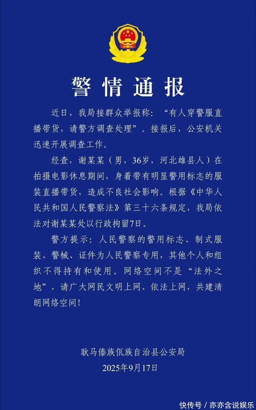 谢孟伟这一行为换来的结果就是,他被行政拘天。