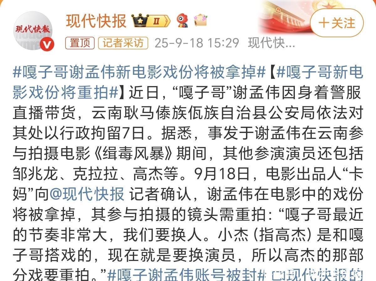 谢孟伟被刑拘后传来坏消息!快手账号被封,新电影戏份也被删除