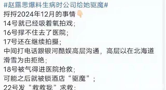 ?????? 无良公司?????? 赵露思的病情是月底被路人拍到爆出来的,在此之前,赵露思已经病了半个月了,可是公司既没有透露消息,也没有积极为她治疗。?????? 据赵露思直播透露,在公司刚刚得知自己生病的时候,第一件事不是带她去医院,而是趁她发病把她关在酒店里请人给她驱魔。?????? 害的赵露思只能自己给朋友发信息“救救我”才得以脱身。