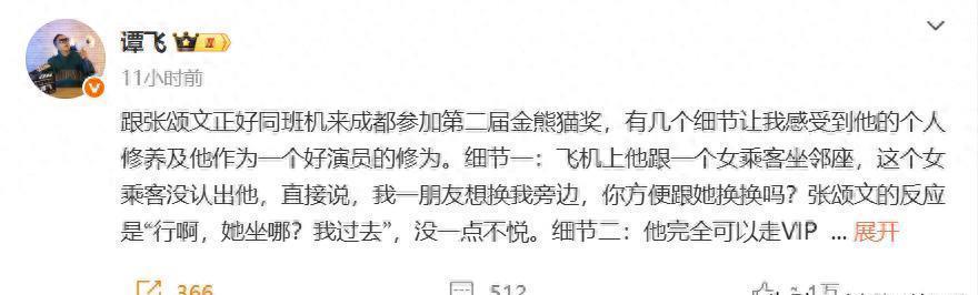 9日,监制、策划人谭飞在自己的社交账号分享了他对演员张颂文的印象。张颂文是去成都参加第二届金熊猫奖的。和谭飞同机的谭飞,有幸亲眼目睹了发生在张颂文身上的三个细节:
