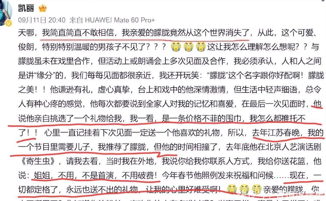 一条推不掉的围巾:去年冬天见面,于朦胧硬塞给她一条高价围巾,“凯丽老师,北京冷,您保暖”。她总想回礼,甚至盘算给他话剧送花篮,他却说“别破费”;不是母子,胜似母子:于朦胧家人常提起张凯丽,他总夸 “我妈特喜欢您”。这份亲情般的联结,让张凯丽哽咽写:“我亲爱的朦胧,你让阿姨往后再想起围巾这事,心得多疼啊……”就如网友说的“以为是平行线,原来是忘年交。”在互联网的大环境下,这年头还有人亲手写长文,足以得见真心换真心啊。